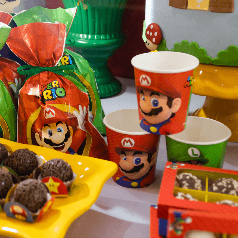 Combine os copos com pratos, guardanapos e outros itens da linha Super Mario para uma decoração completa.
