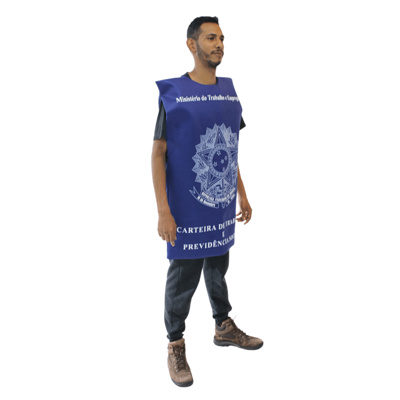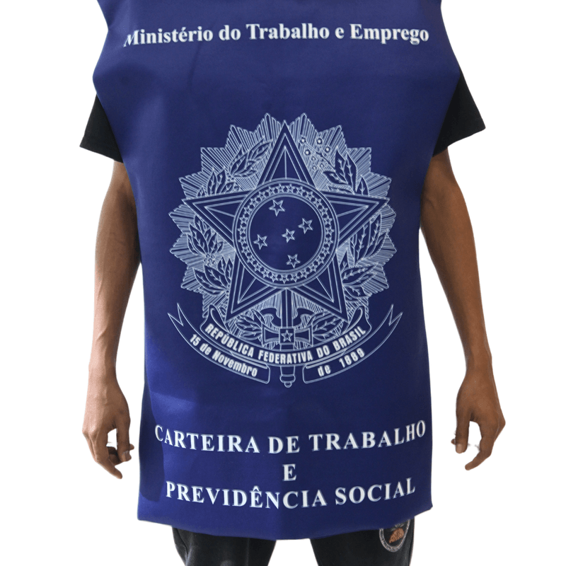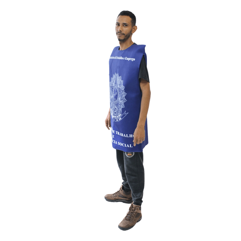 Com design inspirado na tradicional carteira de trabalho brasileira, essa fantasia une humor e criatividade. Possui ombros estruturados, ajuste lateral e corte reto, permitindo o uso com roupas por baixo. Ideal para festas temáticas, campanhas de conscientização e apresentações com tom cômico ou político.