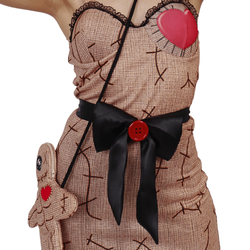 Com modelagem ajustada ao corpo e tecido confortável, essa fantasia é ideal para festas à fantasia, Halloween, eventos temáticos e até apresentações teatrais. O look remete a uma boneca de pano remendada, com traços de costura por toda a peça, um coração vermelho estampado no busto e acessórios que reforçam a estética do voodoo com um toque divertido e original.