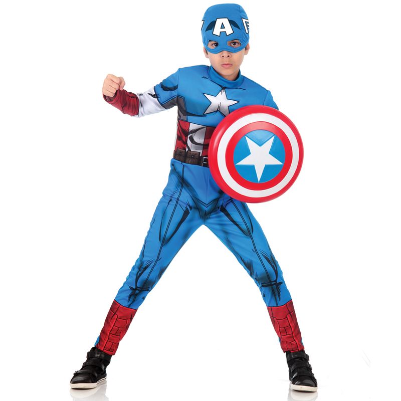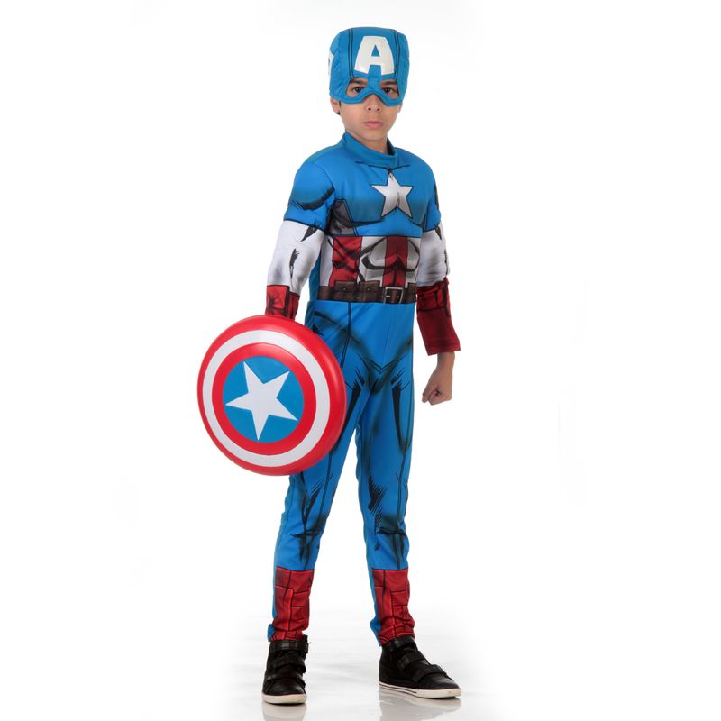 Seu garoto pode fazer justiça ao estilo americano com esta fantasia clássica do Capitão América! Ele vai adorar exibir seus movimentos de combate ao crime com o macacão impresso com a armadura vermelha, branca e azul característica do herói. Os músculos acolchoados nos braços e tronco dão a ele a força do Capitão América. Acompanha a máscara para completar este visual heróico!