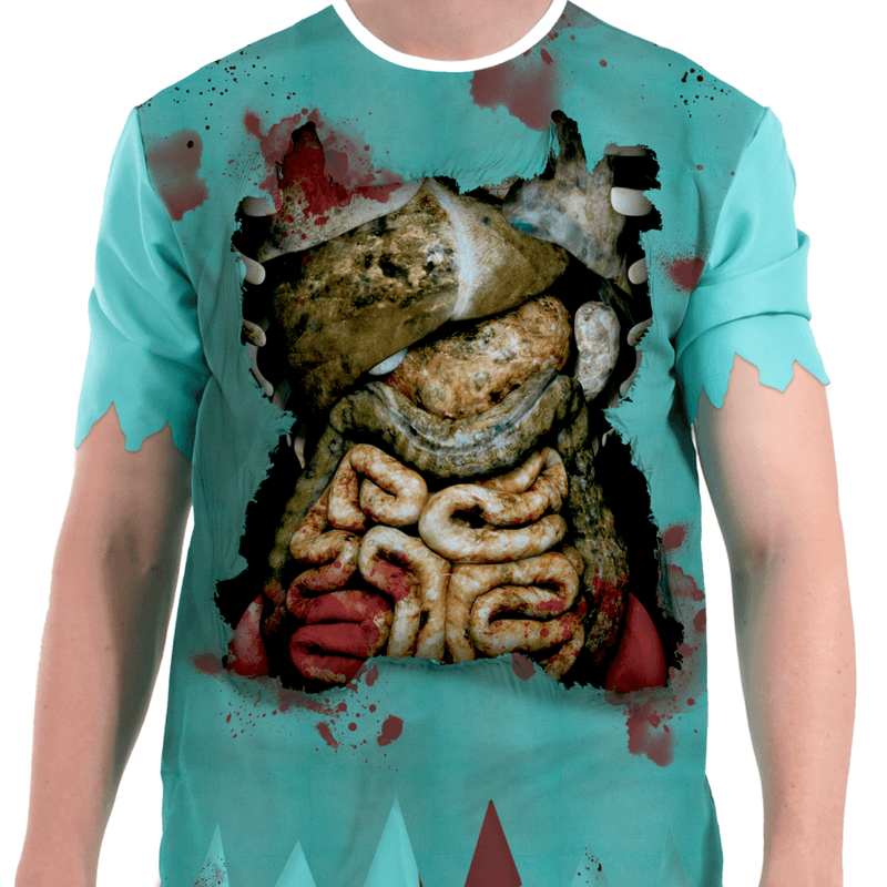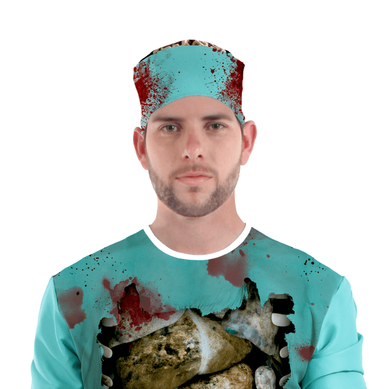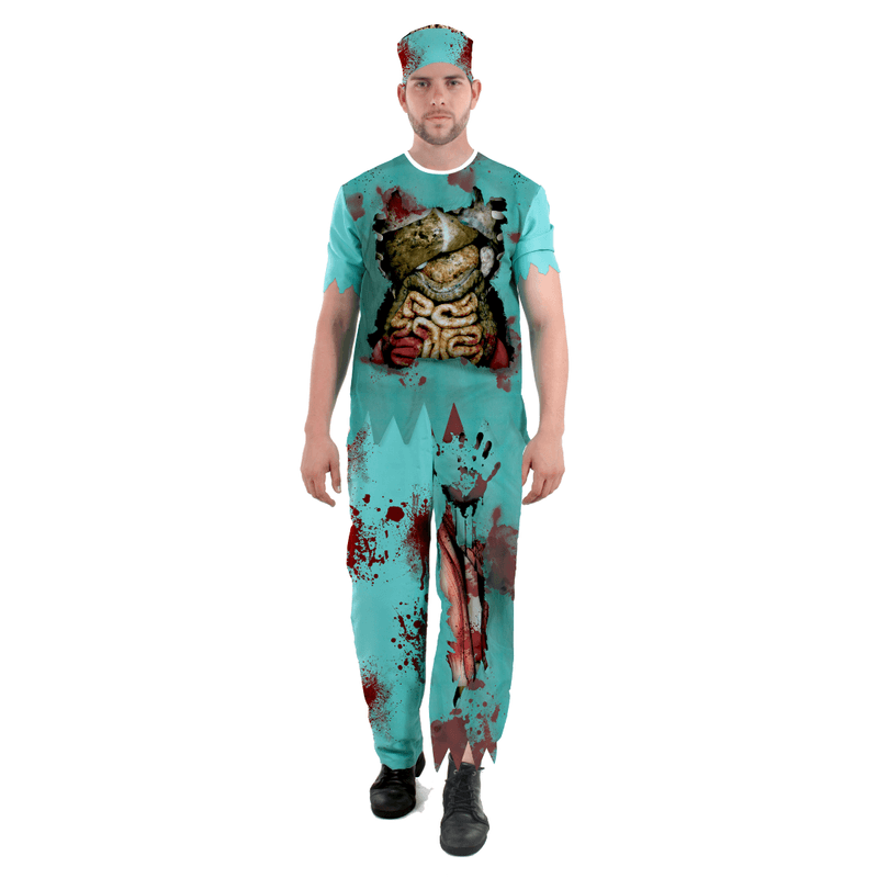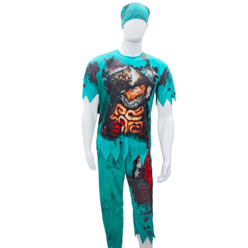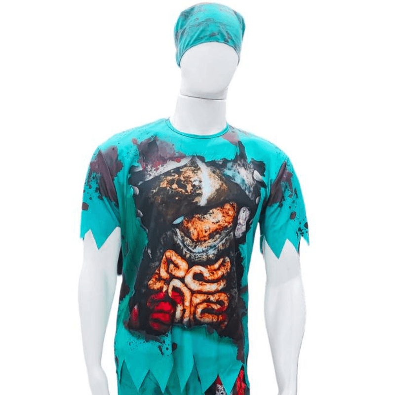Transforme-se em um assustador médico zumbi com esta fantasia detalhada. Perfeita para festas de Halloween, eventos temáticos ou qualquer ocasião que peça um visual aterrorizante! A fantasia inclui uma camisa e calça com estampa de órgãos expostos e manchas de sangue, além de uma touca, criando um efeito visual impressionante.