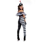 Macacão ajustado em preto e branco com estampa de losangos, proporcionando um visual clássico. Acompanha chapéu e luvas combinando, completando o look de palhaça assassina.Tecido confortável e flexível, ideal para longas horas de festa e diversão.